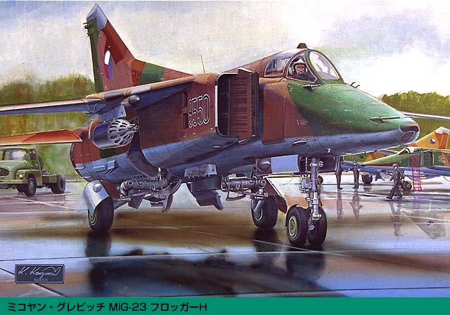 | 旧ソ連で、1970年代に作られた可変翼戦闘機で、アメリカではF-14トムキャットが可変翼機として有名だね。着陸などの低速度では翼を広げ、飛行中の高速時には翼を後ろへ曲げてデルタ翼に近い形にして、速度に合った翼にするなんていう昔からの理想の一つだね。ミグ23のような可変翼機が、最初に作られたのは、第二次大戦終わり頃ののドイツだったよね。でもこれ研究機だったんで、地上でしか翼の角度を変えられなかったけれど・・・。 | ![]() |
