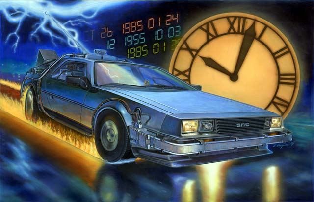 「デロリアン」は1970年代に実際に生産された車で、映画ではそれをベースにしたタイムマシンであるという設定になっている。プルトニュームを燃料とした核融合炉(?)によるエネルギーで、車の周囲につけられたタイムトラベルコイルによって、車の速度が時速140kmに達すると、設定した年月日(時間も?)に瞬時に行けるらしい。時空連続体に穴を開けてトラベルするのか、それをねじ曲げてトラベルするのかわからないが、膨大なエネルギーを消費することは確かなようだ。胴体後部の上面には熱排出用のスチームベントが左右にあるのだが、これが内部にたまった熱の排出用だとすると、これだけでデロリアンは走れそうだ。 実車の「デロリアン」は、もとGM(ゼネラルモータース)副社長だったジョン・Z・デロリアン氏が、GMをやめて創設したDMC社によって、会社が倒産するまでに8500台ほど生産されたといわれているが、この車の形は当時のジウジアーロがデザインした車にも似ている。全体のウエッジシェイプや複数の四角いヘッドライト、ウイングドアなど当時最新のかっこ良さが採り入れられている。個人的にはジウジアーロのへクス(六角形)をグリルやコクピットなど各所に採り入れたデザインの方がずっと気に入っていて、よく勝手にイメージイラストを気取って落書きしていたものだ。 でも、ステンレス製のボディーを無塗装のまま販売するというのは、やはり自動車の常識からは外れたものだったらしい。しかし、飛行機ファンにとってはアメリカ機ならごく普通のことだった。もっとも、クリアーな透明皮膜塗装は塗っていたかもしれないが。 |